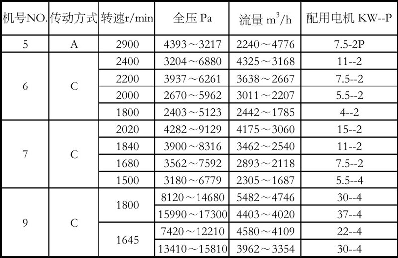 6-30型谷物、粉末輸送離心風(fēng)機(jī)性能參數(shù)表