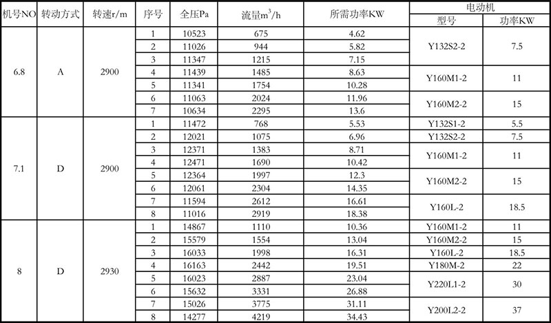 9-12風(fēng)機(jī)為單吸入,機(jī)號有No6.8A、7.1 A、7.7A、 8D、9D共五個機(jī)號。